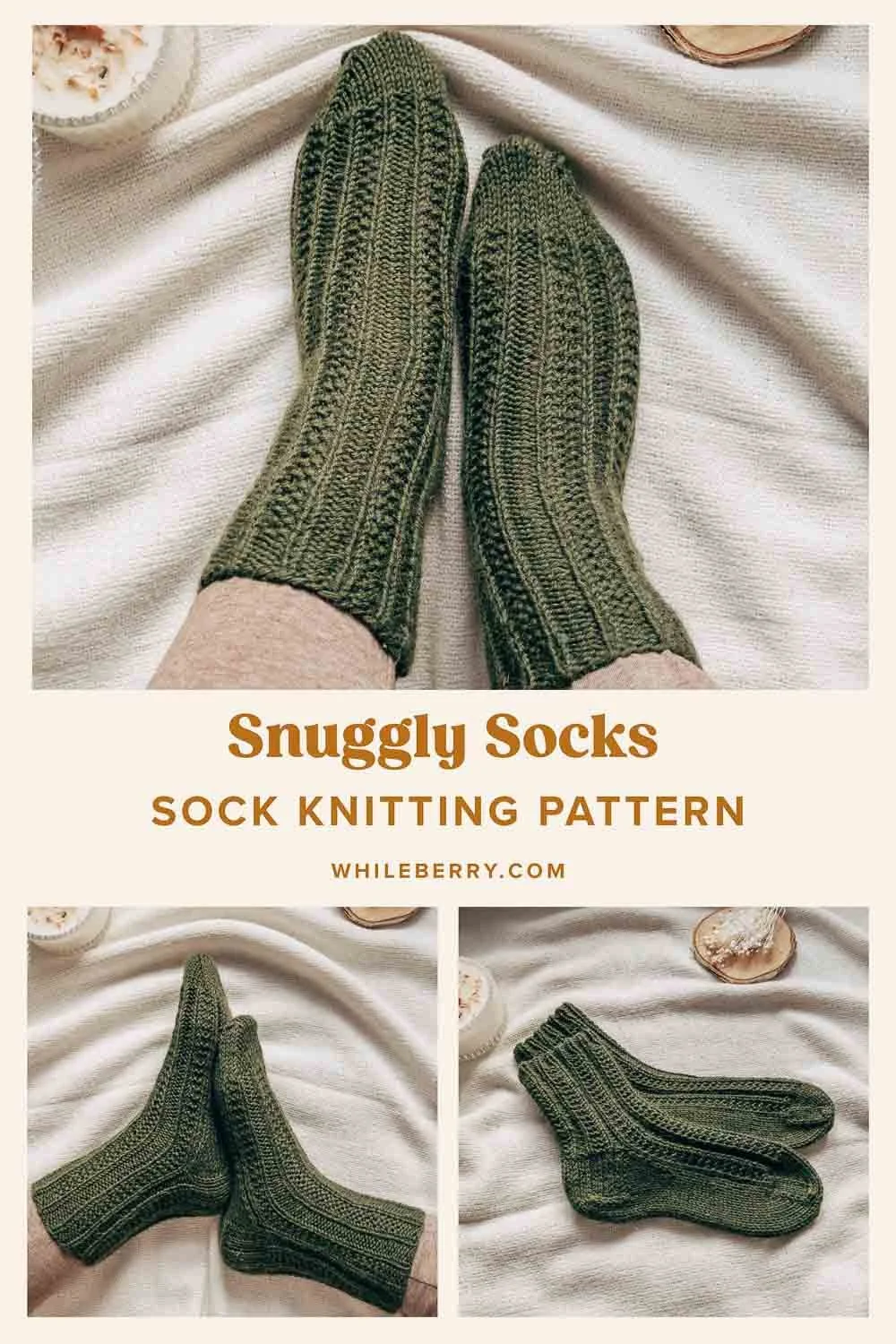 Snuggly Socks are quick and easy to make cozy socks, worked cuff down with a classic heel flap and gusset construction, these may be the perfect choice for your first sock pair, as a quick gift for your close ones or just to make you more cozy in colder season. They're knit in worsted weight yarn so a pair will fly off your needles!